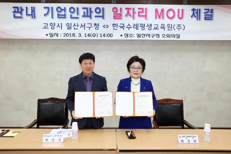 고양시(시장 최성) 일산서구는 경비 교육 전문 기관인 ‘한국수레평생교육원’과 지난 14일 일자리 창출을 위한 업무협약(MOU)를 체결했다.