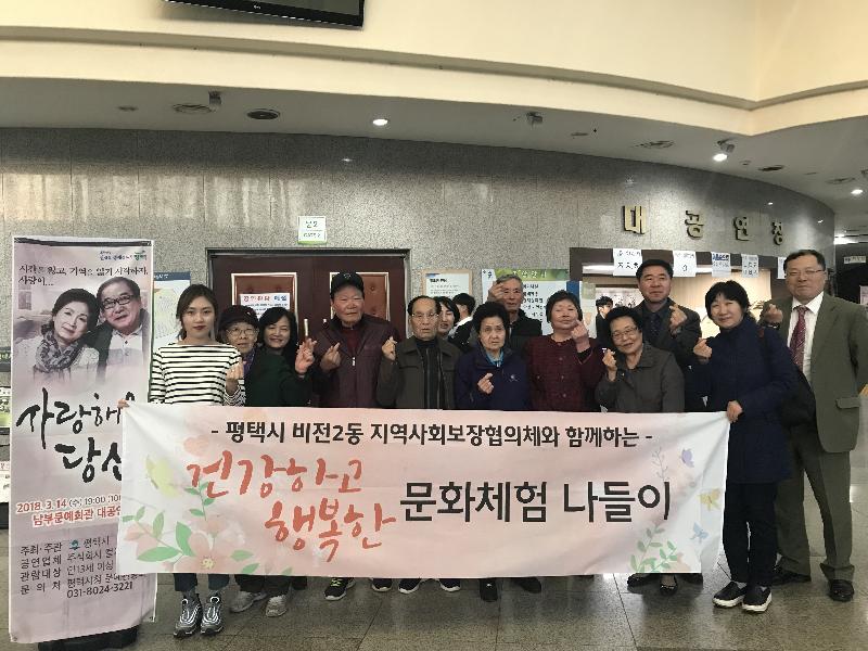 평택시 비전2동 지역사회보장협의체(동장 최중범, 민간위원장 오중근)는 지난 14일 관내 어르신 부부 4쌍을 모시고, ‘건강하고 행복한 문화체험–연극관람’행사를 개최했다.