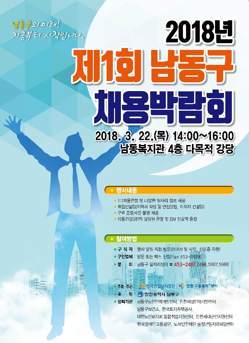 인천 남동구(구청장 장석현)가 오는 22일(목) 남동복지관 4층에서 ‘2018 제1회 남동구 채용박람회’를 개최한다.