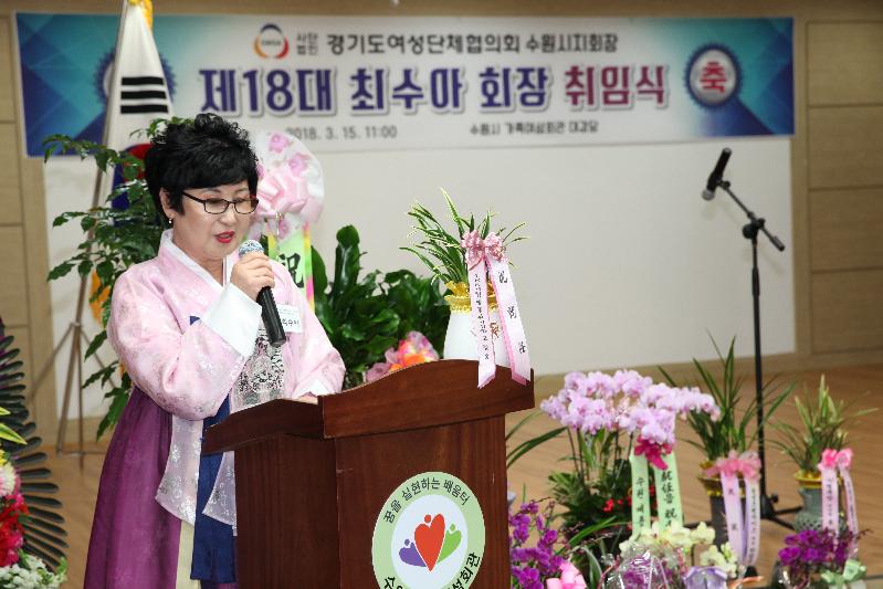 취임식은 15일 수원시가족여성회관에서 염태영 수원시장, 김진관 수원시의회 의장, 이금자 경기도여성단체협의회장과 관련 단체장, 여성단체 회원 등 120여 명이 참석한 가운데 열렸다.