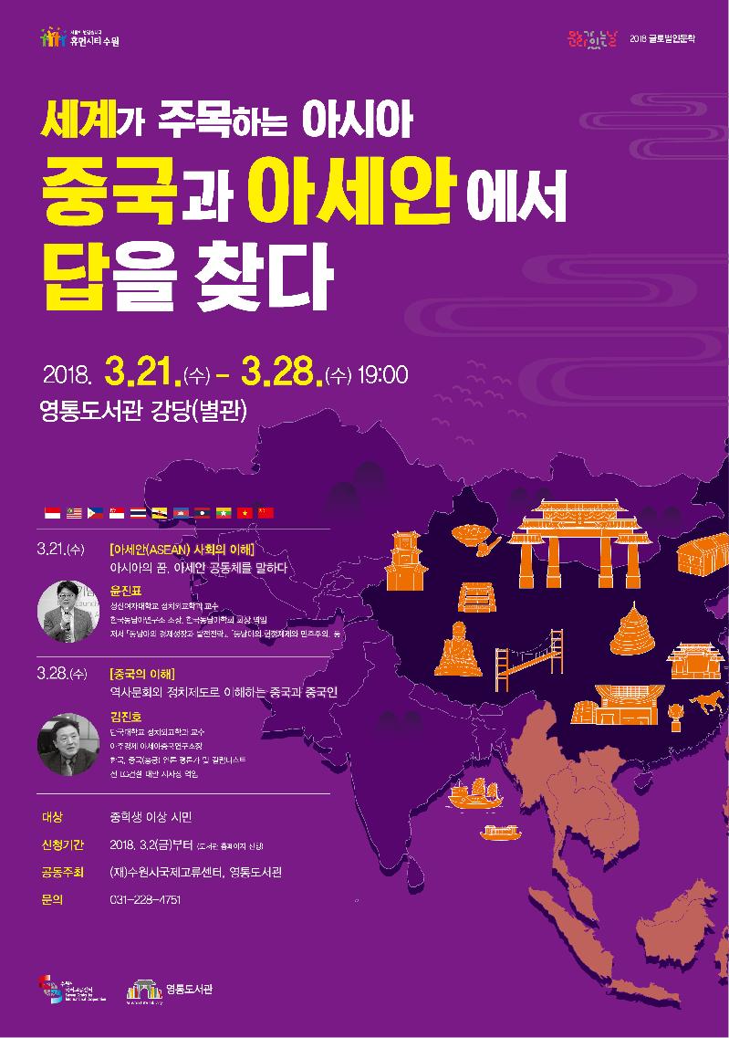 수원시국제교류센터(센터장 노만호)는 수원시 영통도서관에서 오는 21일(수)부터 28일(수)까지 글로벌 인문학‘세계가 주목하는 아시아 : 중국과 아세안에서 답을 찾다’강연을 개최한다.