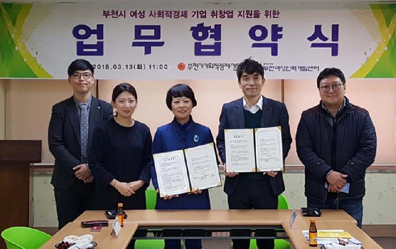 협약의 주요 내용은 ▲각 기관의 창업지원 사업 시 모집 및 홍보 협력 ▲부천시 경력단절여성 대상 인큐베이팅(교육, 코칭, 컨설팅) 지원 ▲경력단절여성들의 사회적경제 기업 취업정보 제공 ▲사회적경제 창업정보 교류 협력 등이다.