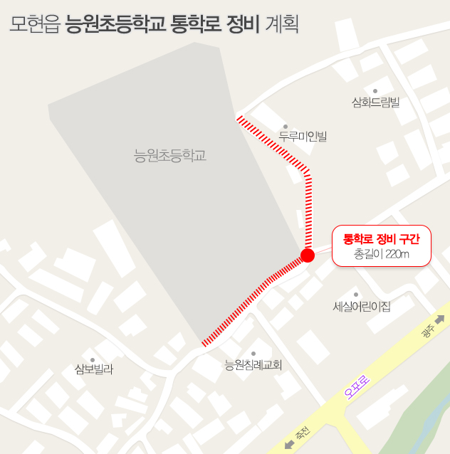 용인시는 처인구 모현읍 능원초등학교 학생들의 안전한 통학을 위해 이 학교 전면과 동측에 길이 220m, 폭 1.5~1.8m의 통학로를 개설키로 했다고 16일 밝혔다.