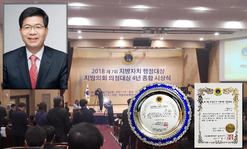 지방자치TV가 주최하는 지방자치행정대상은 전국 지자체를 대상으로 민선6기 4년 동안의 조례발의 통과실적, 공약이행 사항, 지역주민 만족도, 투명성과 청렴성 등 종합심사를 통해 선정했다.