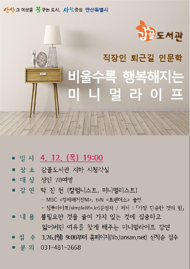 안산시 감골도서관(관장 김종철)은 오는 4월 12일(목) 저녁 7시 감골도서관 지하 시청각실에서 탁진현(칼럼니스트, 미니멀리스트) 강사를 초청해 ‘비울수록 행복해지는 미니멀라이프’주제로 강연을 진행한다.