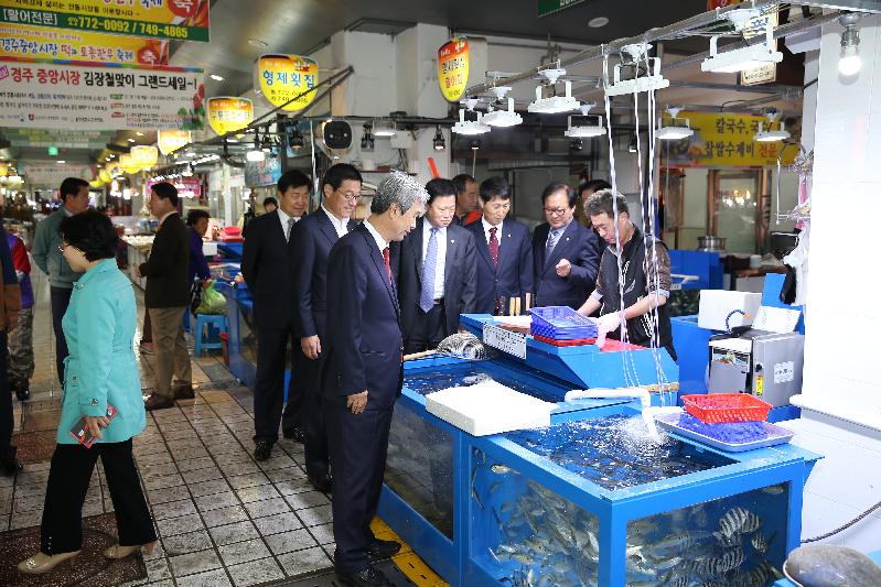 경주시의회 권영길 의장을 비롯한 전체의원들은 11월 12일 제208회임시회 제1차 본회의를 마치고 추석날 화재발생으로 복구를 완료하고 정상영업에 들어간 중앙시장을 방문하여 상인들의 노고를 격려하였다.행사에 참석한 의원들은 새롭게 단장한 선어부 동을 둘러보고 상인들과 일일이 악수를 나누며 그동안의 어려움을 위로하였다.