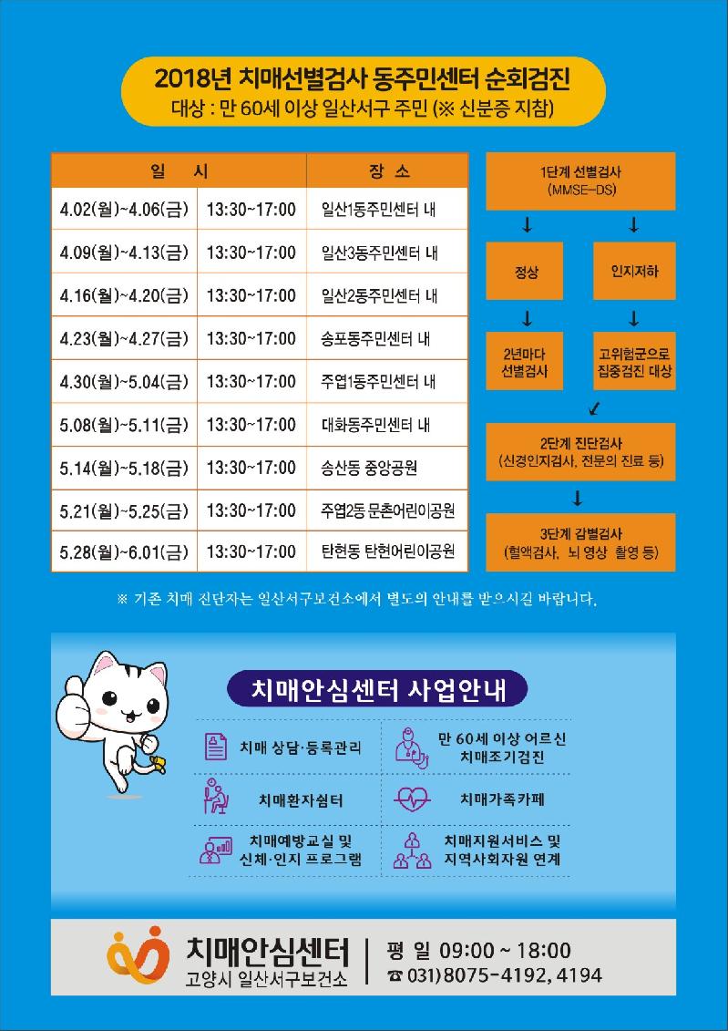 한편 일산서구보건소는 오는 4월부터 일산서구 관내 9개 동 주민센터를 순차적으로 방문해 거동이 불편하거나 정보가 상대적으로 취약한 어르신들을 위해 찾아가는 치매선별검사를 시행한다. 해당일정에 검사를 받지 못하였더라도 만 60세 이상이면 치매안심센터를 내소하면 검사를 받을 수 있다.