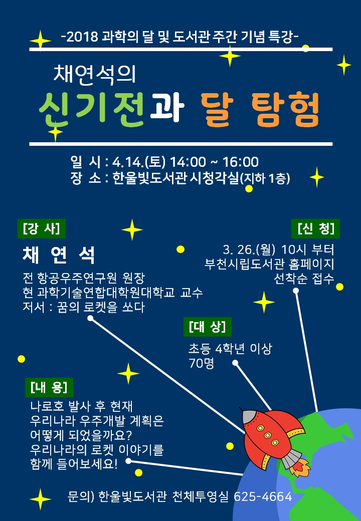 부천시립한울빛도서관은 과학의 달과 도서관 주간을 맞이해 오는 4월 14일(토) ‘채연석의 신기전과 달 탐험’ 특강을 진행한다.