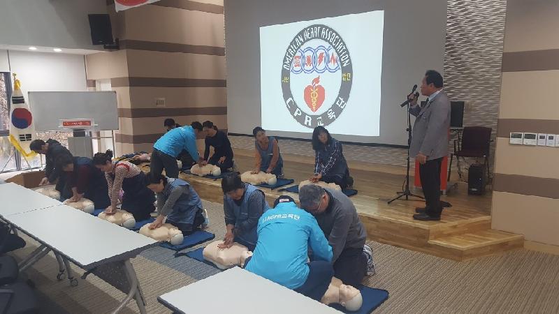 이번 교육에서는 심폐소생술에 대한 학습 동영상을 시청한 후 ▲인형을 활용한 핸즈온리 CPR, ▲관계법령, ▲상황에 따른 다양한 대처방법, ▲기도폐색시의 대처, ▲영유아에 대한 구조법, ▲전기를 사용하는 제세동기의 종류와 사용법, ▲구조요청 요령 등을 다뤘다.