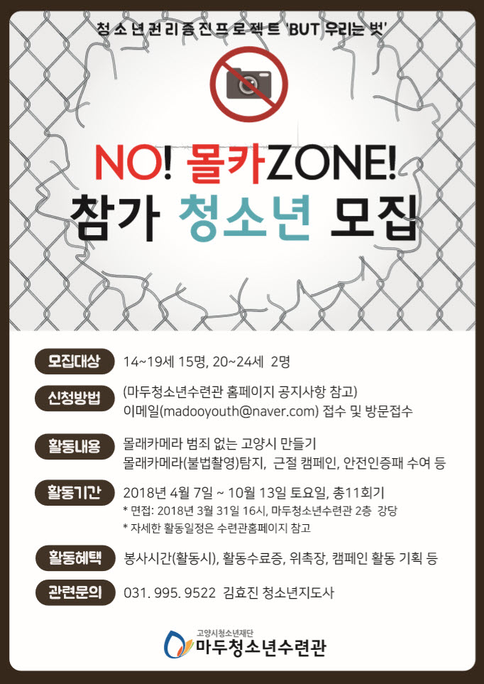 고양시 마두청소년수련관은 몰래카메라 불법촬영 범죄로부터 안전한 고양시를 만들기 위해 ‘NO! 몰카ZONE!’ 프로그램을 진행한다.