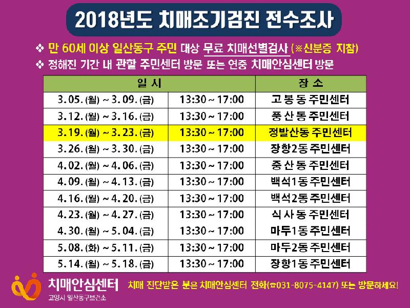 고양시 일산동구보건소는 지난 5일 고봉동 주민센터를 시작으로 만 60세 이상 일산동구 주민 대상 ‘2018년도 치매조기검진 전수조사’를 실시하고 있다.