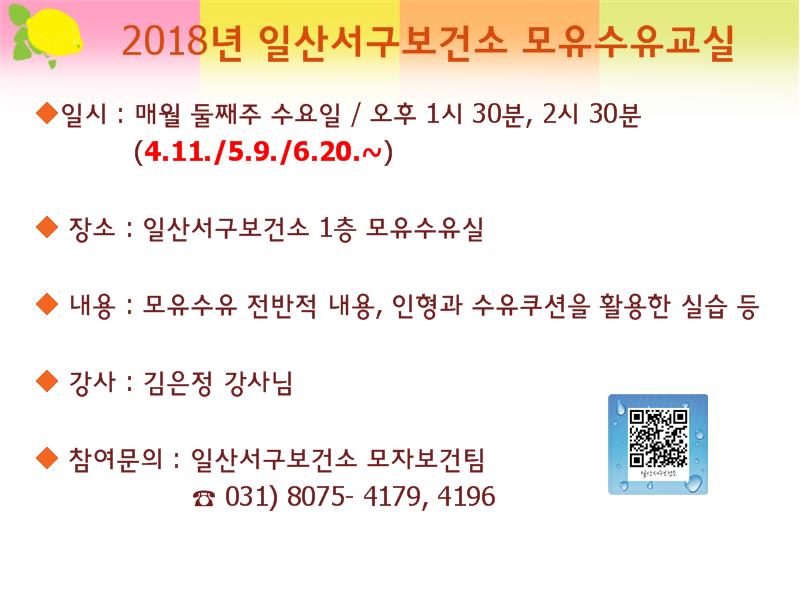 모유수유교실에 참여를 원하는 경우 일산서구보건소 모자보건팀으로 방문 또는 전화(☎031-8075-4179) 신청하면 된다.