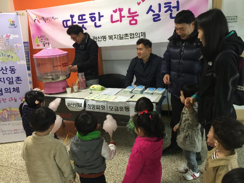 관산동복지일촌협의체는 관산동 지역의 복지사각지대 해소를 위한 지역복지재원 마련을 위해 지난 2월부터 ‘관산1004희망씨앗 모금운동’을 전개하고 있다. 3월 현재 13명의 정기기부자가 72개의 희망씨앗을 모금했으며 올해 12월 말까지 12,048,000원 모금을 목표로 하고 있다. 모금된 기부금은 따뜻한 손길이 필요한 관내 위기가정 및 취약계층을 위해 사용될 예정이다.
