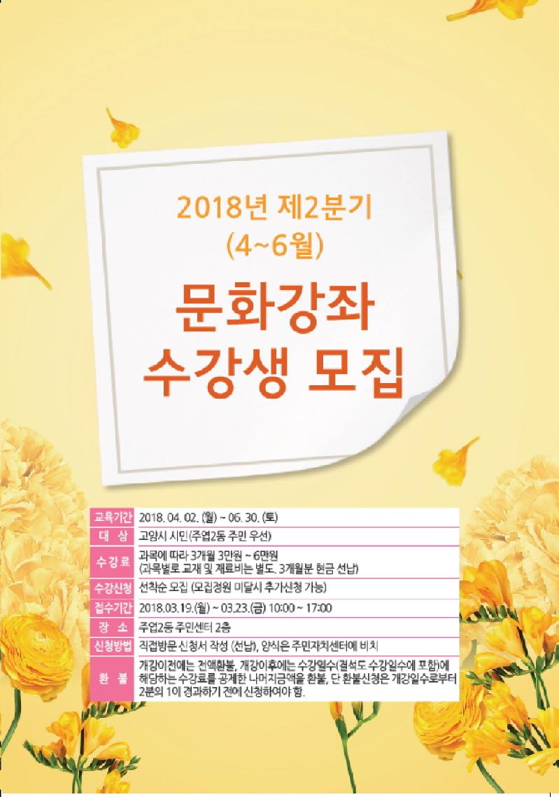 고양시 주엽2동 주민자치센터는 3월 19일부터 23일까지 2분기 문화강좌 수강생을 모집한다. 어학, 건강, 취미, 교육 등의 분야에서 32개의 프로그램이 마련돼 있어 주민들이 저렴한 비용으로 원하는 분야의 강좌를 수강할 수 있도록 했다.