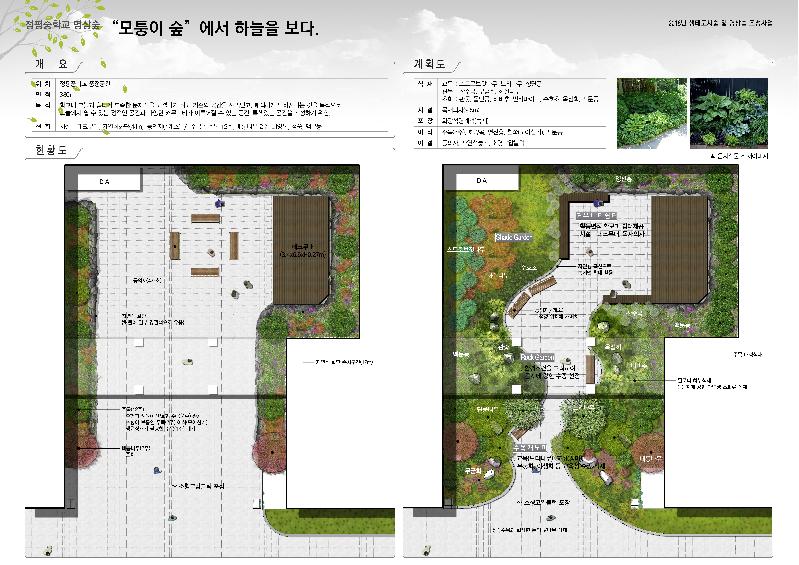 올해는 6,000만원의 예산으로 이 학교 내 ‘모퉁이 숲’으로 불리는 중정공간에 다양한 초목으로 꾸민 커뮤니티 쉼터를 조성하게 된다. 이곳엔 소나무와 단풍나무, 느티나무 등의 나무와 초롱꽃·산수국·비비추 등 야생화를 심어 학생들과 주민들이 즐길 수 있도록 할 예정이다.