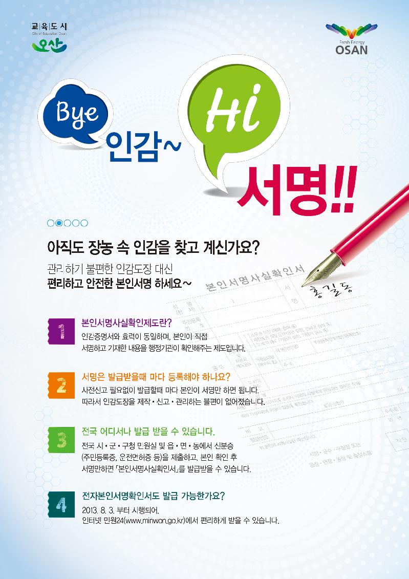시는 현행 인감제도는 인감도장을 제작· 관리하고 사전에 주소지에서 신고를 해야 하는 불편함과 대리발급으로 인한 사고위험성이 높아 사전 등록절차 없이 전국 어디서나 발급 가능하며 본인외 발급이 불가능하므로 사고위험이 없어 편리하고 안전하다는 장점을 지닌 본인서명사실확인서 이용을 적극 홍보하기 위해 전단지를 제작했다.