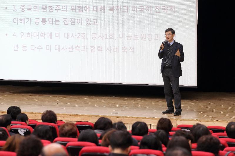 공무원과 주민 등 400여명이 참석한 이날 강연에는 국제정세 분석가로 유명한 남창희 교수(인하대학교 정치외교학 및 융합고고학 교수, 대외협력처장)가 강사로 초빙되어 “인천발 한반도 평화프로세스 비전”에 대한 강연을 펼쳤다