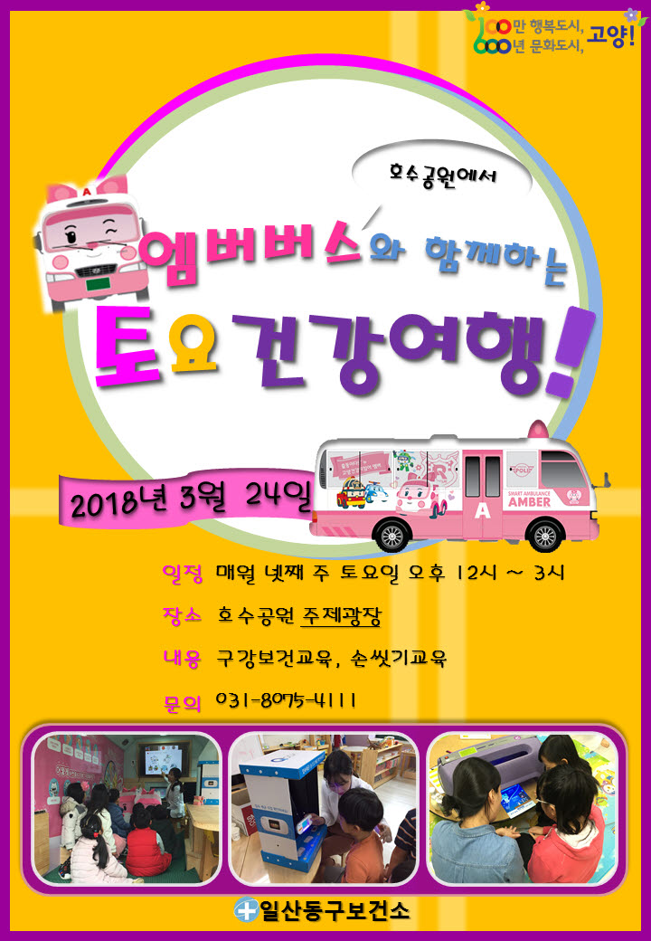 고양시 일산동구보건소는 오는 24일(토) 12시부터 오후 3시까지 호수공원 주제광장에서 ‘엠버버스(어린이 건강버스)와 함께하는 토요건강여행’을 진행한다.