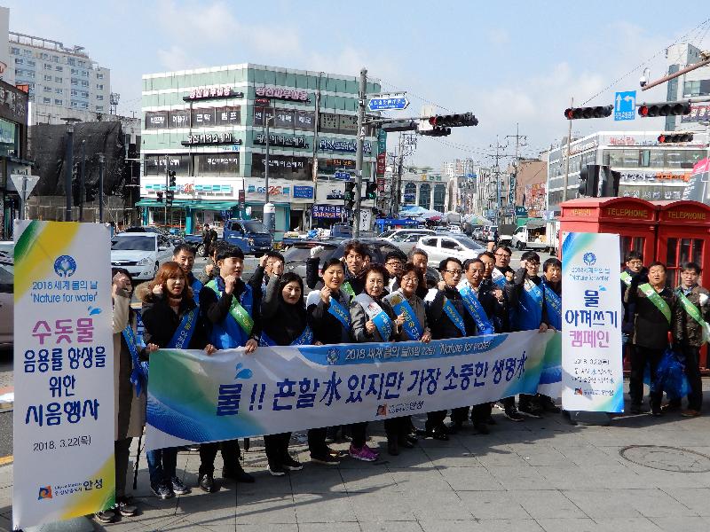 안성시 상수사업소에서는 지난 22일 오전 10시 서인사거리에서 안성시 수돗물평가 위원회 및 관계공무원이 참석한 가운데 시민을 대상으로 ‘2018년 세계 물의 날’ 기념행사를 개최하였다.
