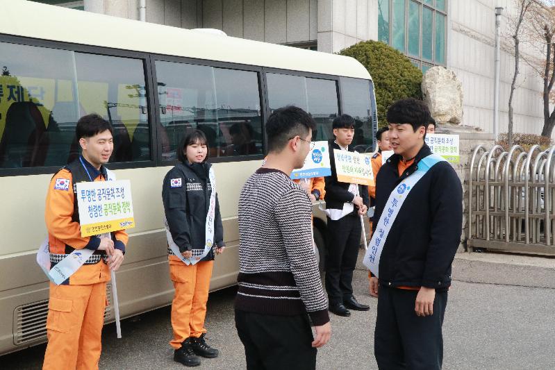 [미디어타임즈=문상수 기자] 인천공단소방서(서장 안영석)는 23일 본서 주차장 입구에서 청렴한 공직문화 정착을 위한 캠페인 활동을 벌였다.이 날 캠페인은 출근하는 직원들을 대상으로 청렴피켓과 유인물 등을 활용해 공직자 청렴실천 독려와 공무원 행동강령 실천과제 관련한 홍보물을 배부했고, 시민들을 대상으로 청렴 문화와 화재 안전을 알리기 위한 어깨띠 및 청렴배너 등의 활동을 벌였다.공단소방서 관계자는“깨끗한 공직사회를 구현하기 위해 우리 모두가 지켜야한다”며“시민이 행복하고 청렴한 공직자 이미지를 만들기 위해 더욱 노력할 것”이라고 전했다.