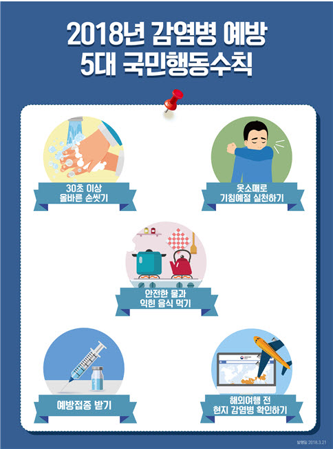 감염병 예방을 위한 5대 국민행동수칙은 ▲30초 이상 올바른 손씻기, ▲옷소매로 기침예절 실천하기, ▲안전한 물과 익힌 음식 먹기, ▲예방접종 받기, ▲해외여행 전 현지 감염병 확인하기다.이옥수 기자 oksu813@naver.com