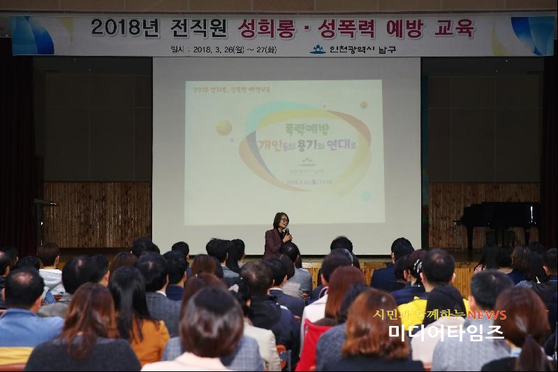 [미디어타임즈=문상수 기자] 인천 남구는 지난 26, 27일 2회에 걸쳐 구청 대회의실에서 전직원을 대상으로 ‘2018년도 성희롱·성폭력 예방교육’을 실시했다.이날 강의에 나선 우명순 국가인권위원회 전문상담위원은 ‘폭력예방 개인들의 용기와 연대로’라는 주제로 최근 확산되고 있는 미투(Me Too)운동의 정의와 직장 내 성희롱·성폭력에 대한 사례, 조치방안 등에 대해 교육했다.구 관계자는 “성에 대한 건전한 가치관 확립이 직장 내 성평등을 실현해 나가는 데에 밑거름이 될 것”이라며 “지속적인 성희롱‧성폭력 예방교육으로 건강한 직장 문화를 만들도록 노력하겠다”고 말했다.