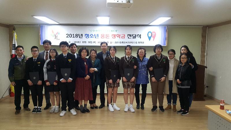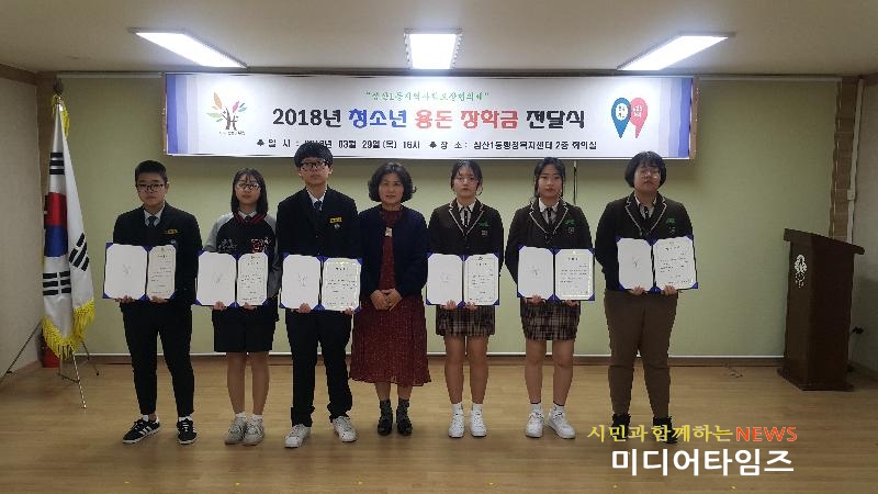 [미디어타임즈=문상수 기자] 인천시 부평구 삼산1동(동장 김건영)은 지난29일 오후4시 삼산1동행정복지센터 2층 회의실에서 ‘2018년 청소년 용돈 장학 증서 전달식’을 가졌다. 삼산1동 지역사회보장협의체 후원금으로 이뤄지는 이날 행사엔 협의체 김종희 위원장을 비롯한 위원 5명과 부평구의회 임지훈 의장, 교육복지사 등이 축하하기 위해 참석했다.용돈 장학생은 부일중학교와 삼산중학교에서 추천받은 3학년 학생으로 저소득 가정 중 타의 모범이 되는 학생 6명이다.장학금은 3월부터 12월까지 10개월 동안 5만 원씩 학생 본인 계좌로 매월 입금된다.용돈 장학금은 학생들이 사용처에 구애받지 않고 어디에든 편하게 사용할 수 있으며, 용돈을 지원받는 동안 어떤 간섭도 받지 않고 품위 유지 및 학생들과의 관계 증진을 위해 사용하면 된다.김건영 삼산1동장은 “학생들이 용돈 장학금을 통해 작게나마 마을공동체의 따뜻한 정을 느끼고, 그동안 해보고 싶었던 일을 할 수 있는 작은 불씨가 됐으면 좋겠다”고 말했다.