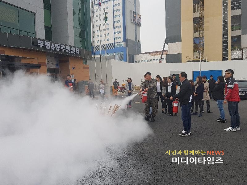 [미디어타임즈=문상수 기자] 인천시 부평구 부평6동주민센터(동장 조권행)는 지난 29일 화재 발생 시 대응능력 제고를 위해 부평소방서 부평119안전센터와 합동으로 소방훈련을 실시했다.동주민센터 직원, 자원봉사자, 소방관 등 30여 명이 참가한 이날 훈련은 화재진압, 인명 대피유도와 구조, 소방안전 교육 실시 등으로 진행됐다.특히, 이번 훈련은 동주민센터 주차장에 실제 화재상황을 연출하여 부평6동 자위소방대원들이 직접 소화장비를 사용하여 발화지점에 화재를 진압하는 훈련을 실시함으로써 현장 대응능력을 강화했다.조권행 부평6동장은 “최근 화재와 관련한 대형 참사가 많이 일어남에 따라 화재 예방 및 초기 대응능력을 높이기 위해 지속적으로 훈련을 실시하여 민원인 안전 및 청사 보호에 최선을 다 하겠다”고 말했다.