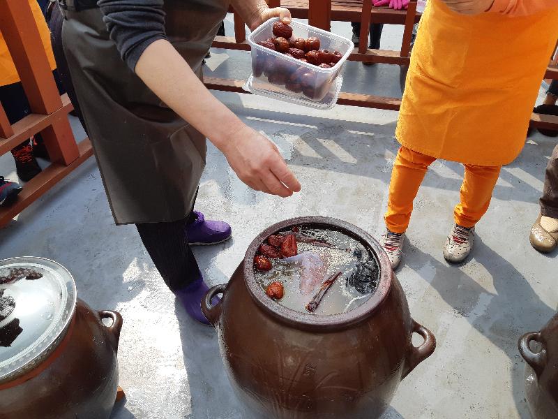 교육 참가자 30여 명은 전통음식 전문가인 박종숙 경기음식연구원장의 안내에 따라 메주와 소금물을 적정 비율로 항아리에 담고, 고추와 대추, 참숯 등을 얹어 장 담그기를 마무리했다.