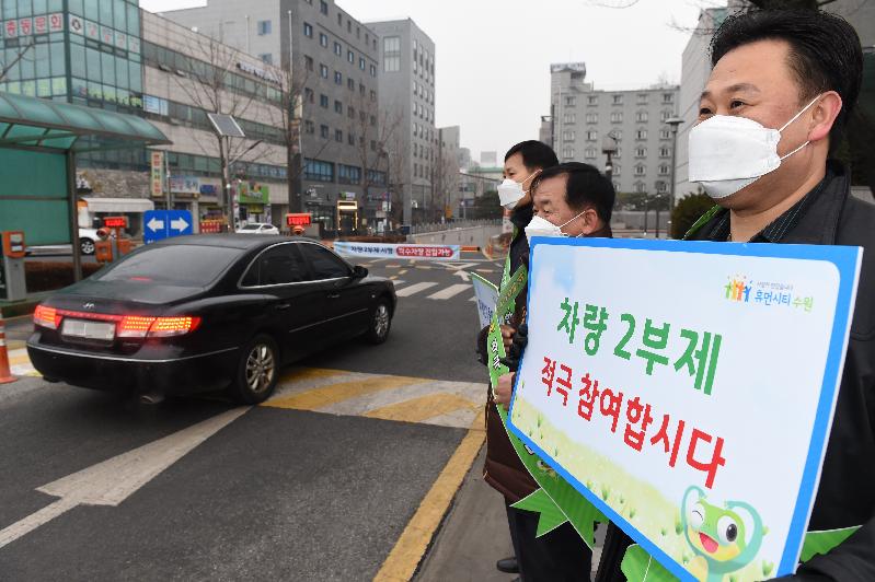초미세먼지가 평균 50㎍/㎥이고 다음날 초미세먼지가 ‘나쁨’ 이상으로 예보되면 단기간에 미세먼지를 줄이기 위한 ‘공공부문 비상저감 조치’를 시행한다. 관용·직원 차량 2부제를 하고, 수원시에서 운영하는 사업장의 가동률을 낮춘다. 수원시 발주 건설공사장은 날림먼지 발생공정을 중지시킨다. 살수차와 분진흡입 청소차량도 운영하며, 수원월드컵경기장 앞 도로에서는 빗물저금통을 활용해 노면 살수시스템을 가동한다.