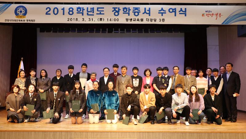 안양시미래인재육성·장학재단(이사장 안양시장 이필운)은 3월 31일 동안평생교육센터 강당에서 학교관계자, 기부자, 장학생 등 300여명이 참석한 가운데 2018년 장학증서 수여식을 개최했다.