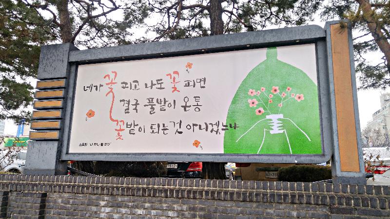 현재 수원희망글판에는 봄편 문안 ‘네가 꽃 피고 나도 꽃 피면 결국 풀밭이 온통 꽃밭이 되는 것 아니겠느냐’가 게시돼 있다. 조동화 시인의 시 ‘나 하나 꽃 피어’에서 발췌한 문안이다.신훈종 기자 hjsgreen77@hanmail.net