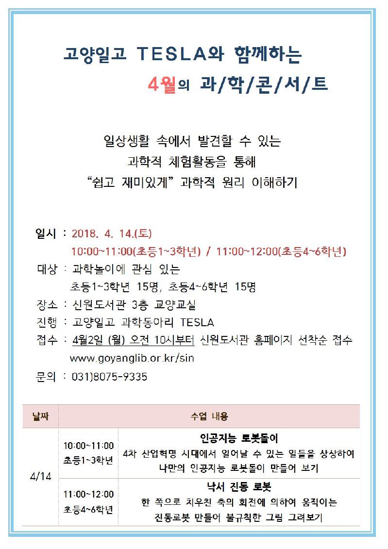 고양시 신원도서관은 과학의 달을 맞이한 4월부터 오는 12월까지 ‘2018년 과학콘서트’를 운영한다. 월별로 각기 다른 과학주제를 선정해 다양하게 진행될 예정이다.