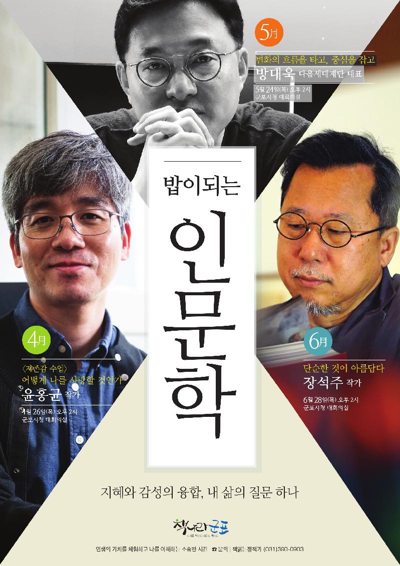 군포시는 시민들과 함께 지혜와 감성을 나누는 소통 공간이자 ‘책나라 군포’의 대표 독서진흥시책 중의 하나인 ‘밥이 되는 인문학’ 2분기 강사로 윤홍균 작가, 방대욱 대표, 장석주 작가를 초빙했다.