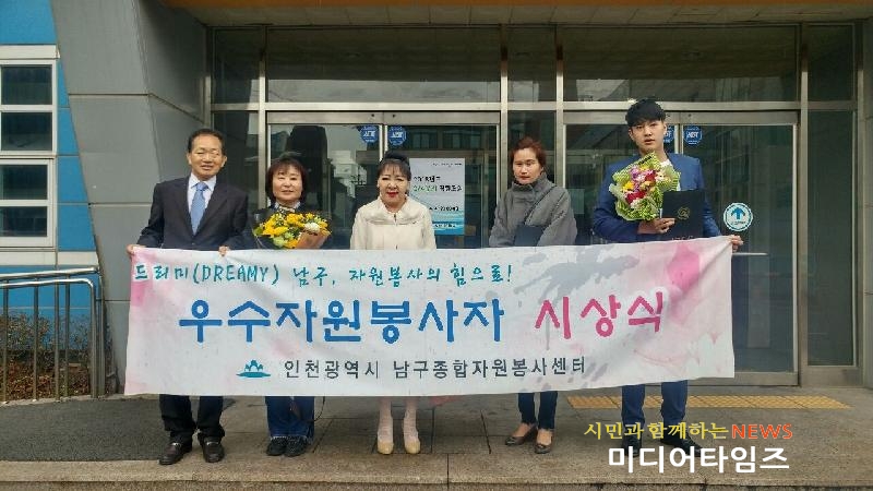 [미디어타임즈=문상수 기자] 인천 남구종합자원봉사센터는 4일 구청 대회의실에서 ‘2018년 1/4분기 우수자원봉사자 시상식’을 가졌다.으뜸자원봉사자로는 김미경(40·여), 노종환(24), 유현주(62·여), 윤혜경(51·여) 등 4명이 선정됐다.관교동 김미경씨는 전통 의상 체험관리와 민속문화놀이 체험, 어르신을 위한 무료급식 및 정서지원 등 지역사회 복지증진 공로를 인정받았다.주안동 노종환씨는 시민경찰 활동으로 청소년 선도 및 범죄예방 활동을 한 공로를 인정받았으며, 숭의동 유현주씨는 청소년 선도 활동, 어르신 무료 급식봉사활동 등 지역사회 발전을 위해 헌신한 공로를 인정받았다.문학동 윤혜경씨는 어려운 이웃을 위한 구호물품 전달, 세탁봉사, 장애인탁구협회 경기활동 등을 지원한 공로를 인정받았다.한편 남구자원봉사센터는 자원봉사 활성화를 위해 헌신하는 으뜸자원봉사자를 분기별로 선정, 남구청장 훈격의 표창을 통해 자원봉사자의 사회적 인정과 자긍심을 고취시키고 있다.