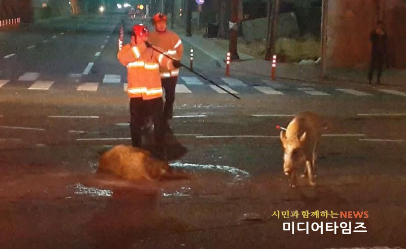 | 삼산동에 멧돼지 2마리 출몰..1마리 포획 사진. <ⓒ미디어타임즈> |
