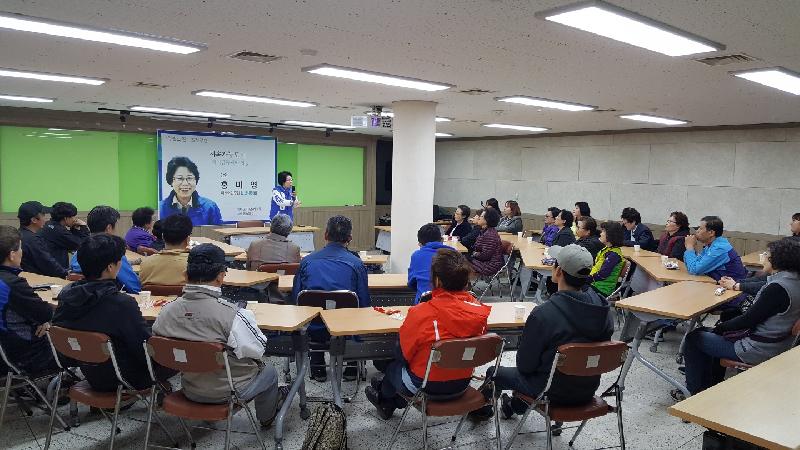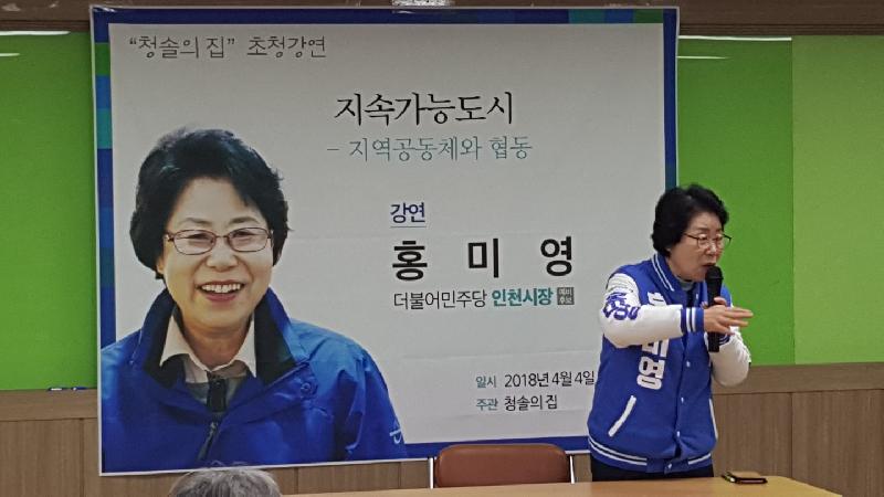 [미디어타임즈=문상수 기자] 홍미영 더불어민주당 인천시장 예비후보는 지난4일 오후 남동구 만수동 소재 남동지역자활센터에서 열린 초청 강연에 참석, ‘지속가능도시-지역공동체와 협동’을 주제로 특강을 했다.‘청솔의 집’ 주관으로 마련된 이날 강연회에서 홍미영 인천시장 후보는 50여명의 남동구 주민 등을 대상으로 서민들과 함께 살아온 자신의 삶을 소개하고, “인천시장에 당선되면 인천을 ‘모든 사람이 더불어 잘사는 지속가능한 도시’로 바꿔 놓겠다”고 강조했다.홍미영 인천시장 후보는 “그동안 우리 사회가 동네 어르신과 어린이들을 서로 보살피며 살아왔으나 어느 순간부터 남을 돌아보지 않고 문을 걸어 잠그고 사는 세상이 됐다”며 “소외층이 외롭지 않은 세상을 만들기 위해 협동조합을 활성화시키고 자활센터와 실업극복 시설 등에 더 많은 예산을 투입, 인천을 따뜻한 도시로 만들겠다”고 주장했다.도시상징물에 10억~100억 원씩의 예산을 사용하는 우를 범하지 않고 시민의 삶의 질 향상에 최우선 목표를 두는 행정을 펴겠다고 밝혔다.소외층 학생들을 위해 운영하는 지역아동센터와 방과후 학교 간에 갈등이 발생하지 않도록 교육청과 잘 협의를 하고 시민들을 부지런히 만나 주민 불편 사항을 최우선적으로 고쳐 나겠다고 덧붙였다.인천 미세먼지 발생의 주범인 영흥 화력발전소와 인천국제공항 등이 이익금을 중앙으로 모두 가져가지 못하도록 자치분권을 강화해 예산을 확보하는 한편, 복지 분야에 사업비를 집중 집행하겠다고 말했다.매일 아침 출근길 시민들을 상대로 벌이는 선거운동 과정에서 시민 표정에서 웃음기를 찾기 어려운 안타까운 현실을 소개하며 4년 후에는 시민 행복감이 늘어난 인천이 되도록 최선을 다하겠다고 강조했다.행사 참석자들은 복지예산이 축소되면서 활동 보조인들을 줄이거나 복지 사업 자체를 접는 사례가 늘어나고 있다며 시장에 당선되면 복지 예산을 획기적으로 늘려 줄 것을 호소했다.