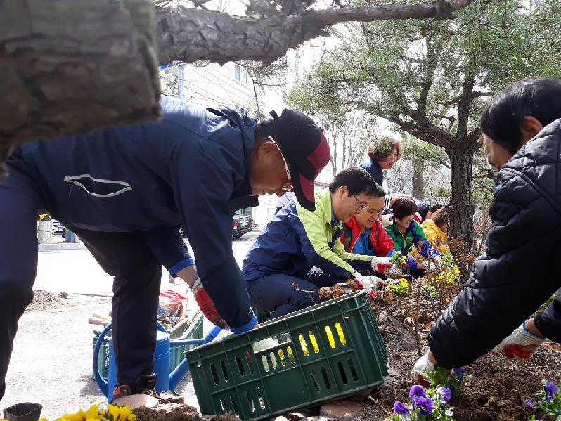 이날 작업은 통장협의회와 지역주민 등 50여명이 참여해 청사주변을 깨끗이 정비하고 화단 흙을 고른 후 시 꽃묘장에서 지원받은 데이지, 비올라, 팬지 등을 식재했다.