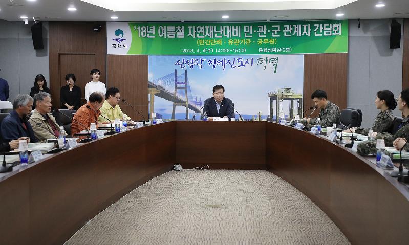 평택시(시장 공재광)는 지난 4일 종합상황실에서 평택시장 주재로 자율방재단, 경찰서, 소방서, 군부대, 유관기관, 민간단체, 재난담당 공무원 등 60여명이 참석한 가운데 여름철 자연재난 사전대비 민ㆍ관ㆍ군 간담회를 개최했다.