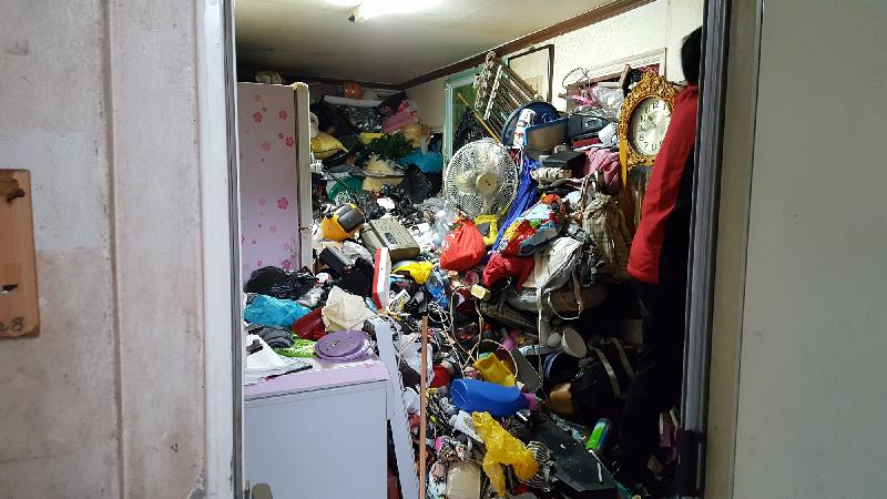 고강1동 다세대주택 지하1층에 거주하는 이○○ 어르신의 집에는 폐가전제품, 폐가구, 폐휴지 등 쓰레기가 출입문 입구부터 방 안까지 쌓여 있었으며, 이로 인해 악취뿐 아니라 화재 위험에도 노출되어 있었다.