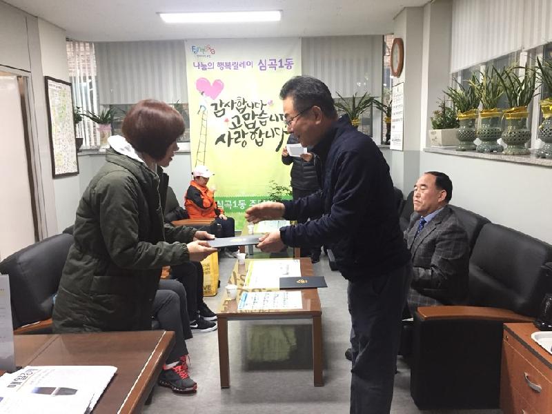 이날 장학금 전달은 심곡1동 장학회 오경석 회장이 장학생으로 선발된 학생을 대신하여 참석한 학부모에게 장학금을 전달하였다.