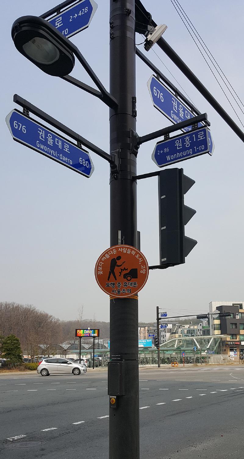 고양시가 보행 중 휴대폰 사용 위험성을 각인시키고자 횡단보도 인근에 보행 안전표지판을 설치했다.