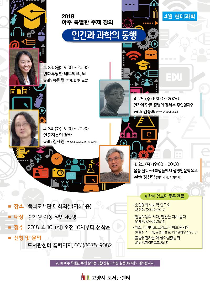 이번 강좌는 현대인들의 관심이 높은 뇌 과학, 인공지능, 질병, 유전학을 주요내용으로 한다. ▲4월 23일 송민령 작가의 ‘변화무상한 네트워크, 뇌’, ▲24일 김재인 교수의 ‘인공지능의 철학’, ▲25일 김홍표 교수의 ‘인간이 만든 질병의 정체는 무엇일까?’, ▲26일 강신익 박사의 ‘몸을 살다-사회 생물에서 생명 인문학으로’를 주제로 이뤄질 예정이다.