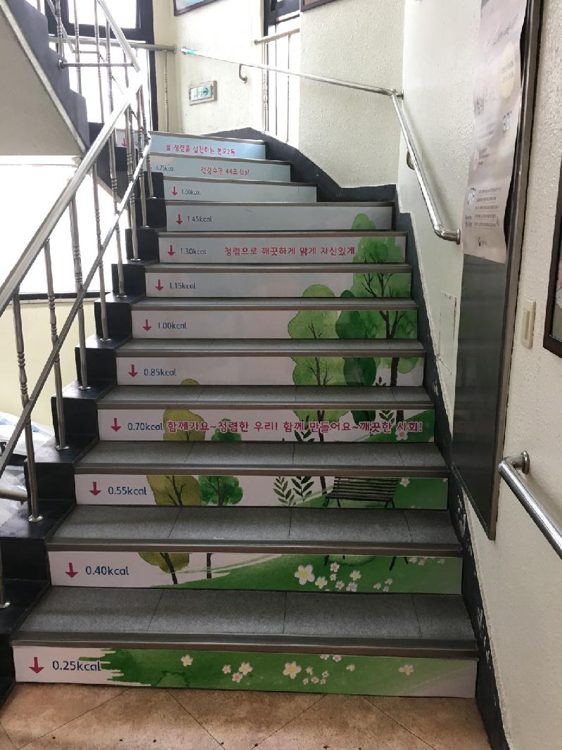 청렴 계단 한쪽 면에 “함께가요~ 청렴한 우리! 함께 만들어요 깨끗한 사회!” 문구와 “청렴으로 깨끗하게 맑게 자신있게” 문구를 기록해서 청렴 계단을 오를 때마다 직원들은 청렴을 다짐한다.