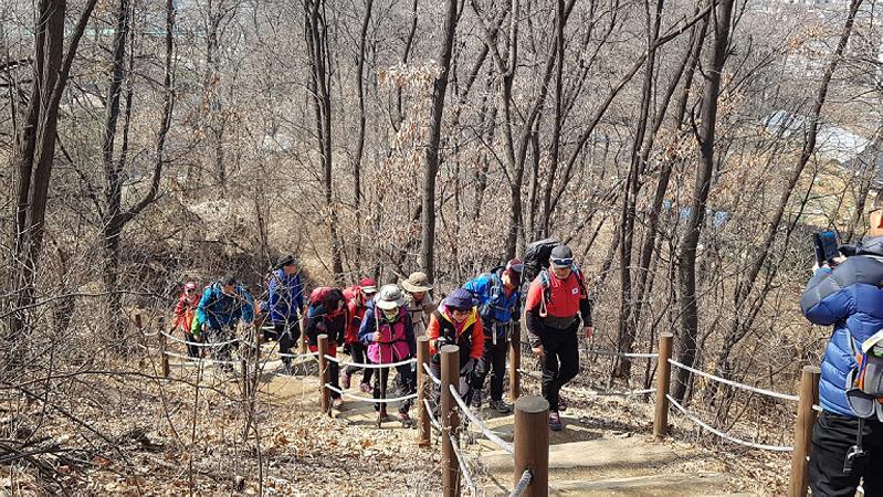 | 성남시 등산교실 참여자들이 지난해 3월 성남누비길 2구간인 검단산을 오르고 있다. <사진=성남시청 제공> |