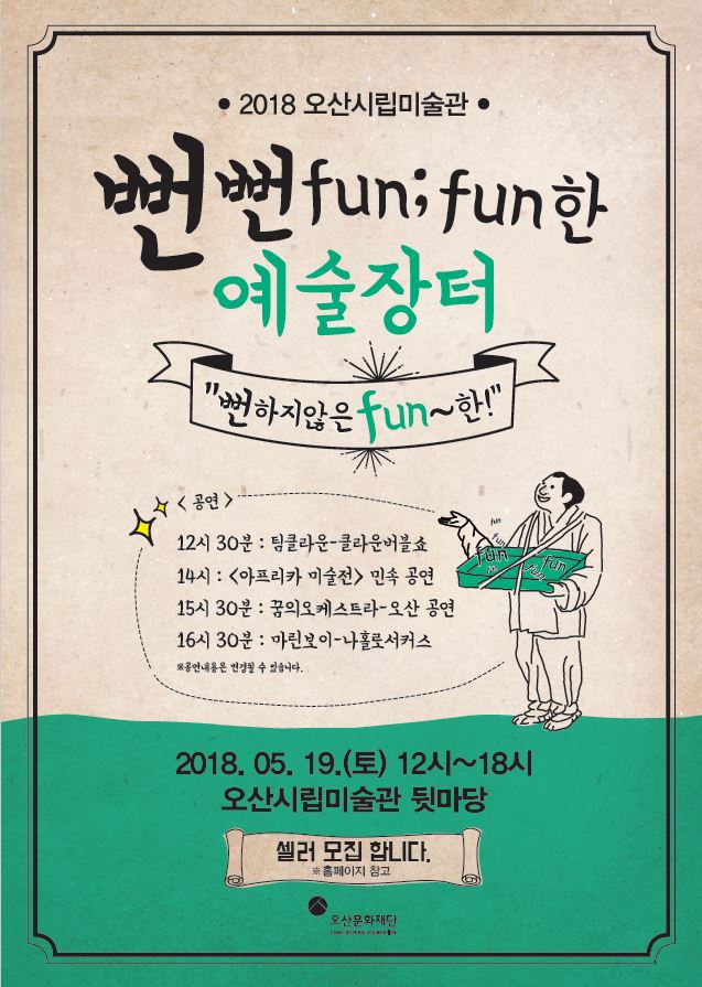 행사는 5월 19일 토요일 12시부터 오후 6시까지 오산시립미술관 뒷마당에서 예정되어 있으며, 현재‘뻔뻔(fun;fun)한 예술장터’에 참여할 다양한 분야의 셀러들을 모집 중에 있다.