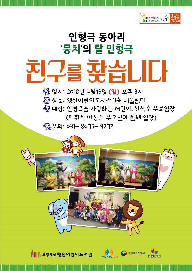 인형극은 행신어린이도서관 인형극 동아리 ‘뭉치’가 진행한다. ‘뭉치’는 결성 7주년을 맞은 극단으로 고양시 내 도서관, 학교, 유치원 등에서 ‘거인이야기’, ‘초롱연못의 울리’ 등 매년 다양한 주제의 공연을 선보이고 있다.
