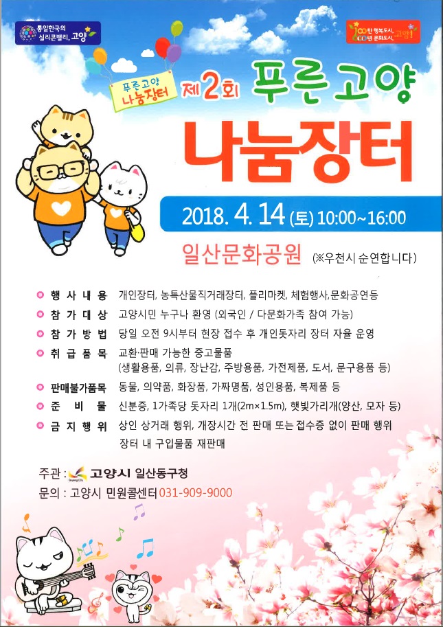 고양시 일산동구는 재활용을 생활화하고 건전한 소비 풍토 조성 및 지역 문화와 어우러진 축제의 장 마련을 위해 오는 14(토)일 일산문화공원에서 ‘제2회 푸른고양 나눔장터’를 개장한다.