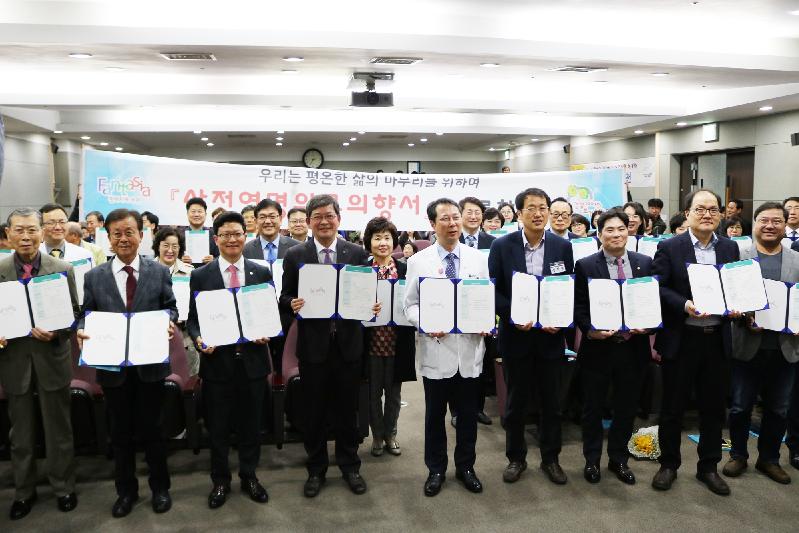 행사는 1부 기념식과 2부 심포지엄으로 이뤄졌다. 1부에서는 보건사업 유공자 표창과 강동구 부천시의회 의장, 원혜영 국회의원의 축사 후 각계 대표 20인이 참여한 사전연명의료의향서 작성 퍼포먼스가 진행됐다.