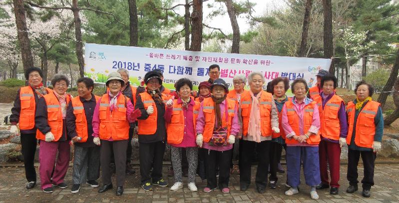 별산사랑 봉사대는 중4동 70세 이상 어르신으로 구성된 생활환경정비 봉사단체로 생활환경정비에 대한 어르신들의 솔선수범을 통해 지역 주민들의 자발적 참여를 유도하여, 깨끗하고 살기 좋은 별산마을을 가꾸고 어르신들의 사회참여 기회를 확대하고자 모집되었다.